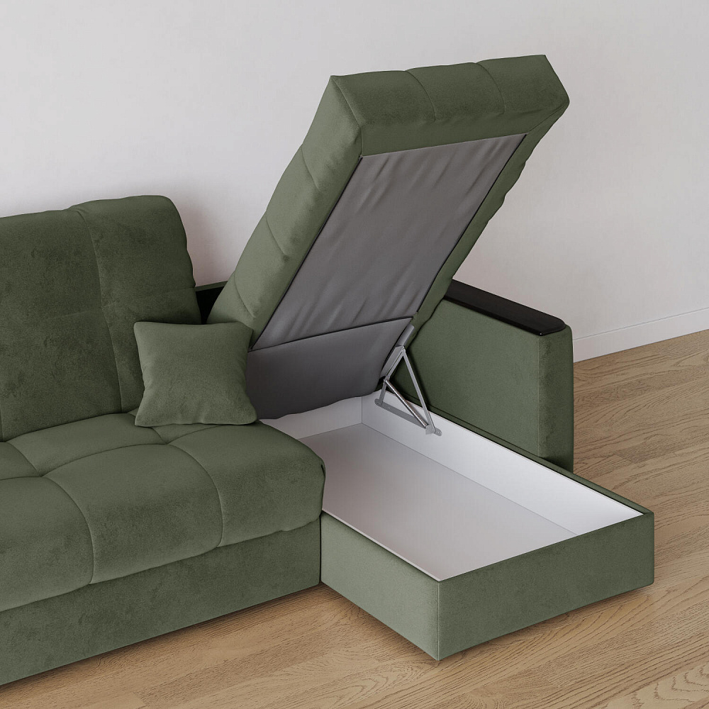 - Короб для белья. В оттоманке дивана скрыт просторный бельевой ящик, в котором можно разместить все необходимые постельные принадлежности.