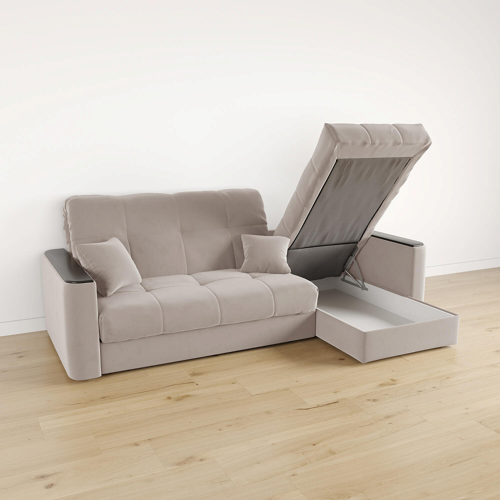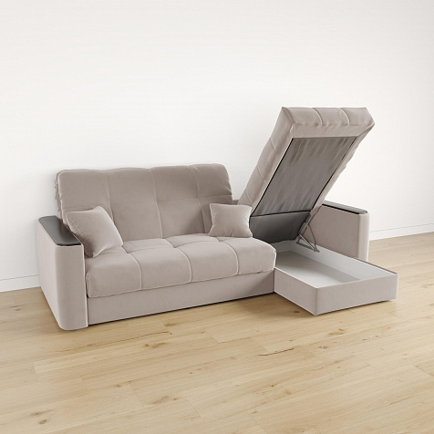 - Короб для белья. В оттоманке дивана скрыт просторный бельевой ящик, в котором можно разместить все необходимые постельные принадлежности.