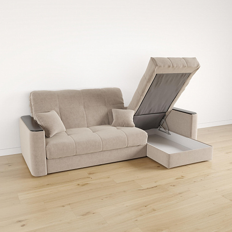 - Короб для белья. В оттоманке дивана скрыт просторный бельевой ящик, в котором можно разместить все необходимые постельные принадлежности.