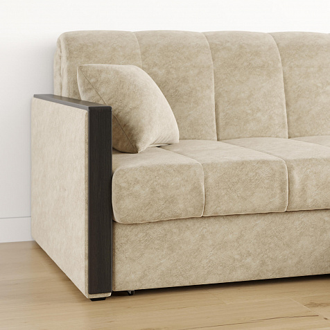 Механизм трансформации «Аккордеон». Чтобы разложить диван, необходимо приподнять сиденье и слегка потянуть на себя, далее диван разложится сам. Поверхность спального места ровная, без петель и швов, поэтому сон будет приятным и комфортным. Прорезиненные ролики защитят напольное покрытие от истирания.