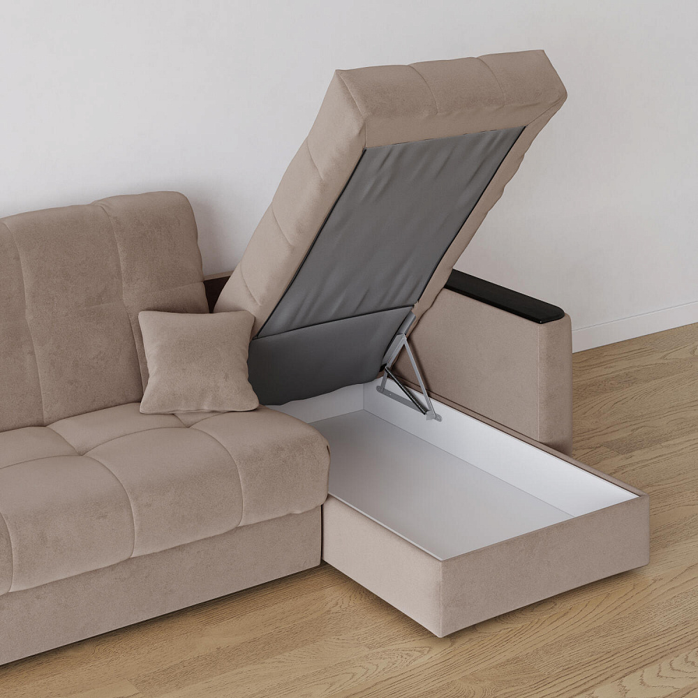 - Короб для белья. В оттоманке дивана скрыт просторный бельевой ящик, в котором можно разместить все необходимые постельные принадлежности.