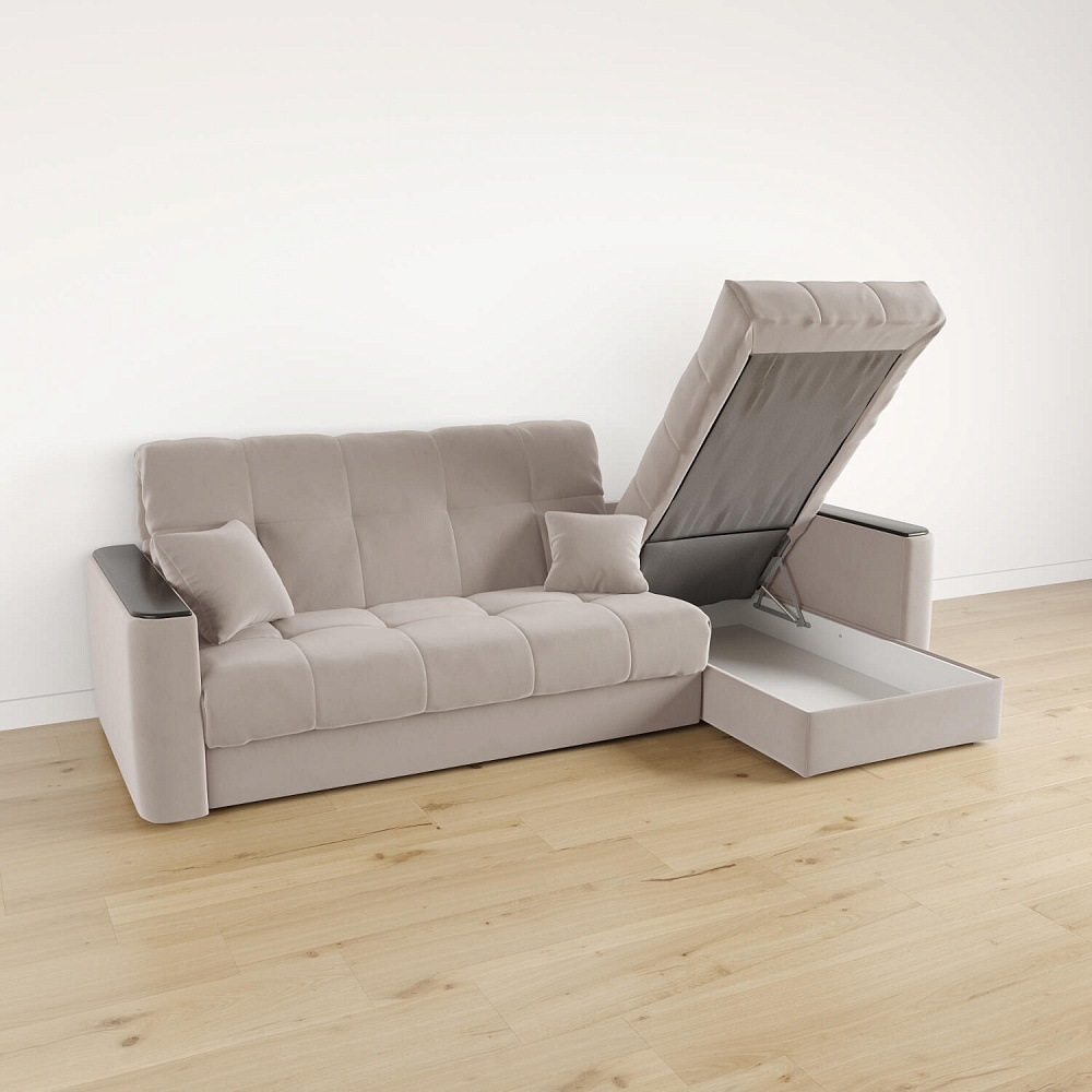 - Короб для белья. В оттоманке дивана скрыт просторный бельевой ящик, в котором можно разместить все необходимые постельные принадлежности.