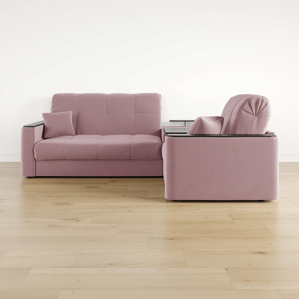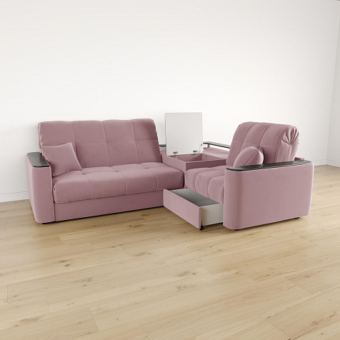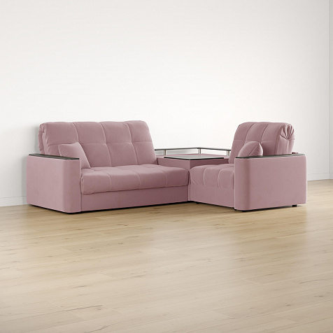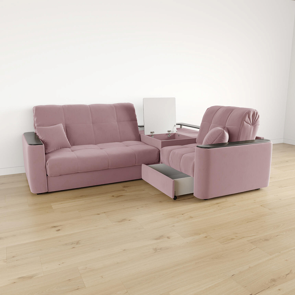 Диван угловой «Камелот» с баром станет главным местом для отдыха и приема гостей. Модель оснащена баром, на котором можно расположить еду и напитки во время просмотра фильмов и сериалов. Пропорциональные формы, плавные линии на сиденье и спинке подчеркивают лаконичный дизайн, поэтому диван подойдёт для любого современного интерьера. Диван создаст в комнате комфортную обстановку и придаст ей неповторимый вид.