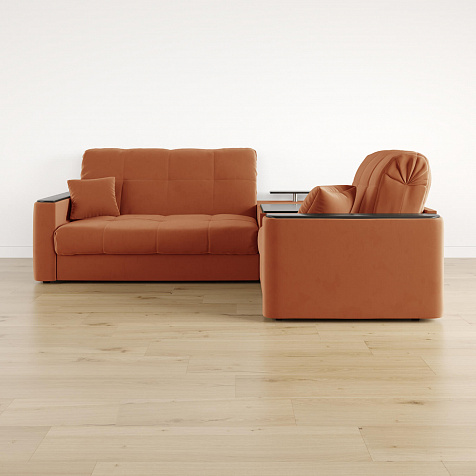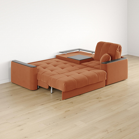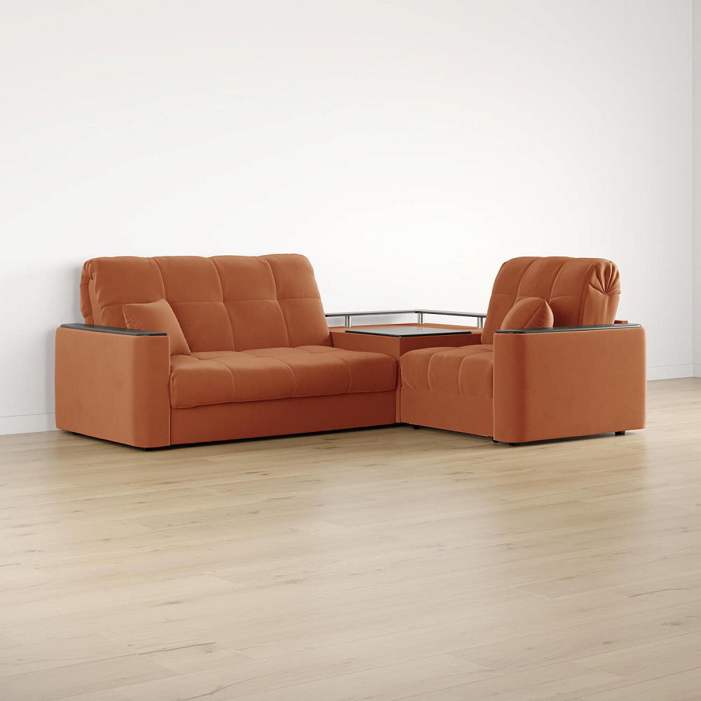 Диван угловой «Камелот» с баром станет главным местом для отдыха и приема гостей. Модель оснащена баром, на котором можно расположить еду и напитки во время просмотра фильмов и сериалов. Пропорциональные формы, плавные линии на сиденье и спинке подчеркивают лаконичный дизайн, поэтому диван подойдёт для любого современного интерьера. Диван создаст в комнате комфортную обстановку и придаст ей неповторимый вид.