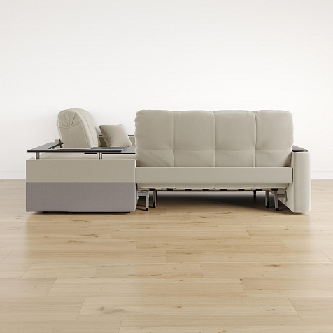 - Вместительная система хранения. Под баром расположен вместительный короб, а в угловом модуле — глубокий ящик. В них удобно хранить одеяла, подушки, пледы и постельное белье.
