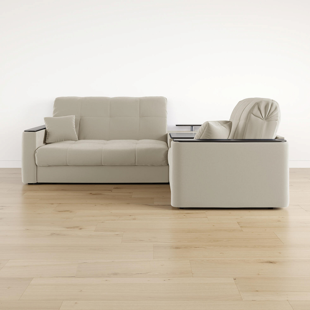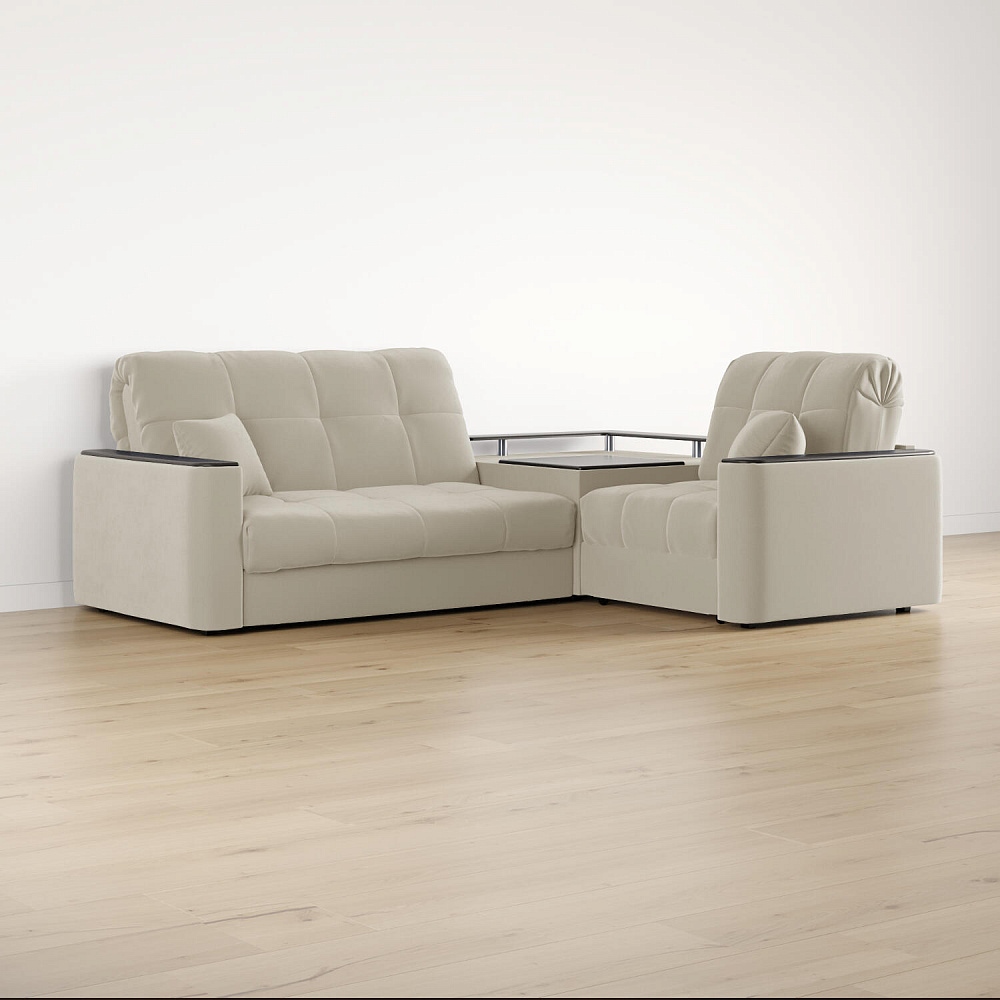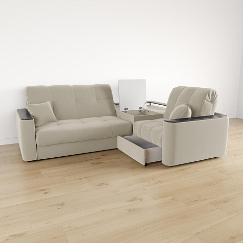 Диван угловой «Камелот» с баром станет главным местом для отдыха и приема гостей. Модель оснащена баром, на котором можно расположить еду и напитки во время просмотра фильмов и сериалов. Пропорциональные формы, плавные линии на сиденье и спинке подчеркивают лаконичный дизайн, поэтому диван подойдёт для любого современного интерьера. Диван создаст в комнате комфортную обстановку и придаст ей неповторимый вид.