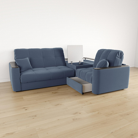 - Вместительная система хранения. Под баром расположен вместительный короб, а в угловом модуле — глубокий ящик. В них удобно хранить одеяла, подушки, пледы и постельное белье.