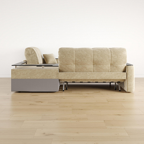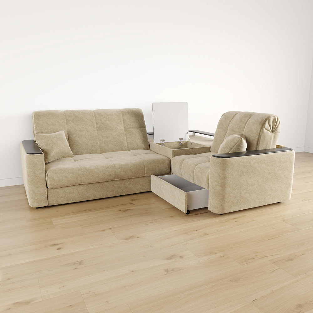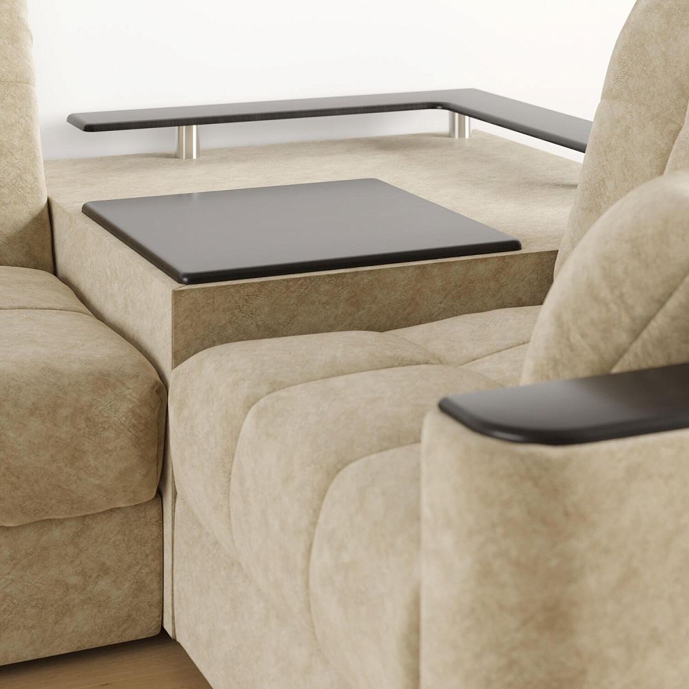 Диван угловой «Камелот» с баром станет главным местом для отдыха и приема гостей. Модель оснащена баром, на котором можно расположить еду и напитки во время просмотра фильмов и сериалов. Пропорциональные формы, плавные линии на сиденье и спинке подчеркивают лаконичный дизайн, поэтому диван подойдёт для любого современного интерьера. Диван создаст в комнате комфортную обстановку и придаст ей неповторимый вид.