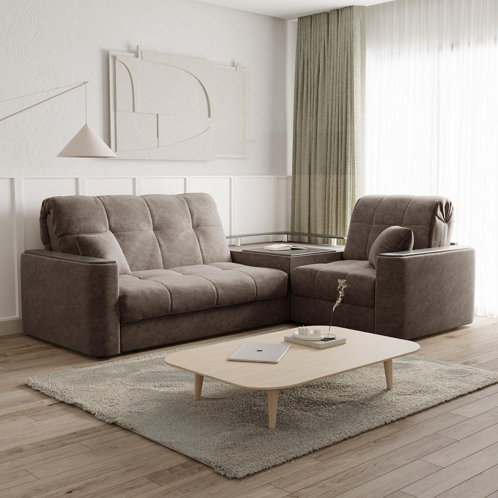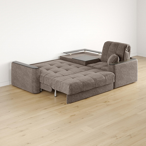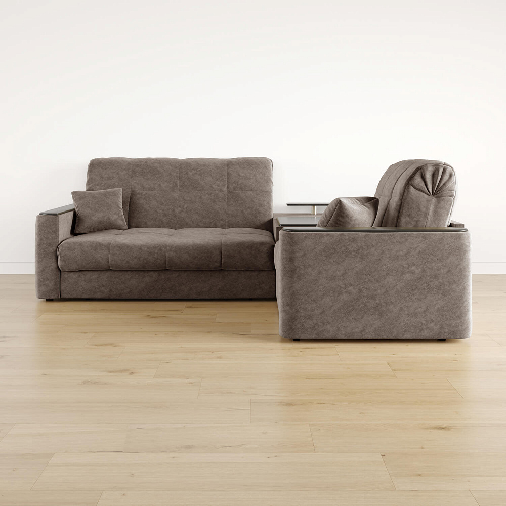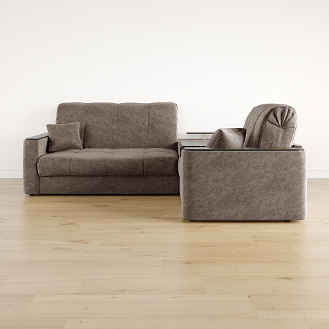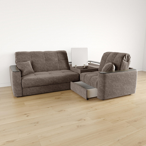 Диван угловой «Камелот» с баром станет главным местом для отдыха и приема гостей. Модель оснащена баром, на котором можно расположить еду и напитки во время просмотра фильмов и сериалов. Пропорциональные формы, плавные линии на сиденье и спинке подчеркивают лаконичный дизайн, поэтому диван подойдёт для любого современного интерьера. Диван создаст в комнате комфортную обстановку и придаст ей неповторимый вид.