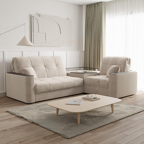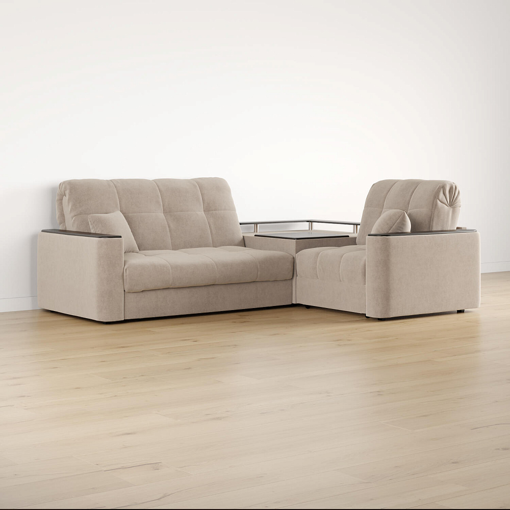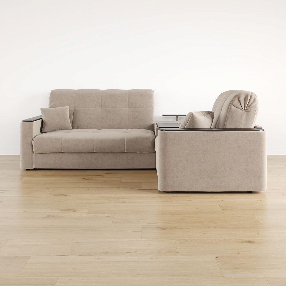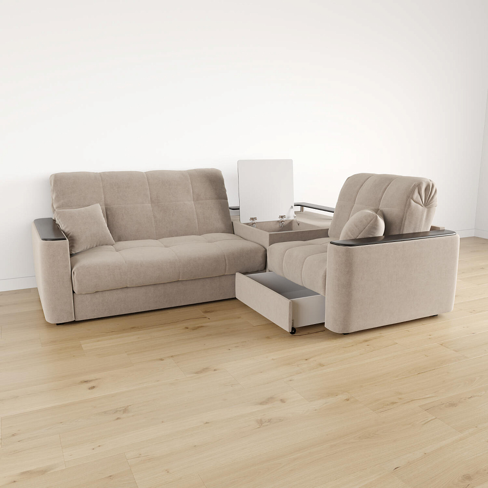 Диван угловой «Камелот» с баром станет главным местом для отдыха и приема гостей. Модель оснащена баром, на котором можно расположить еду и напитки во время просмотра фильмов и сериалов. Пропорциональные формы, плавные линии на сиденье и спинке подчеркивают лаконичный дизайн, поэтому диван подойдёт для любого современного интерьера. Диван создаст в комнате комфортную обстановку и придаст ей неповторимый вид.