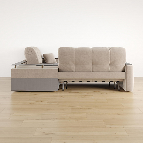 - Вместительная система хранения. Под баром расположен вместительный короб, а в угловом модуле — глубокий ящик. В них удобно хранить одеяла, подушки, пледы и постельное белье.