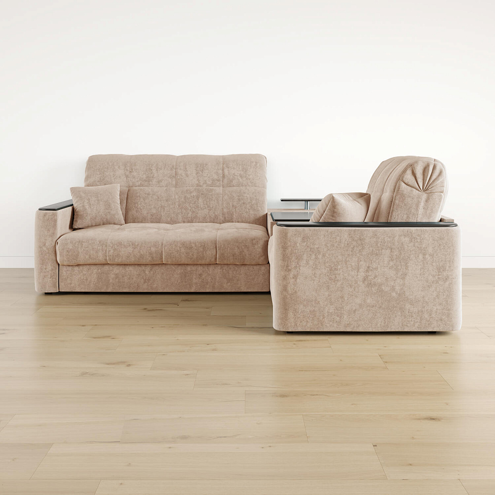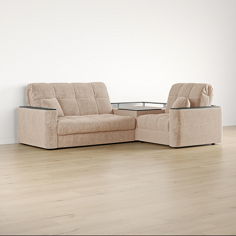 Диван угловой «Камелот» с баром станет главным местом для отдыха и приема гостей. Модель оснащена баром, на котором можно расположить еду и напитки во время просмотра фильмов и сериалов. Пропорциональные формы, плавные линии на сиденье и спинке подчеркивают лаконичный дизайн, поэтому диван подойдёт для любого современного интерьера. Диван создаст в комнате комфортную обстановку и придаст ей неповторимый вид.