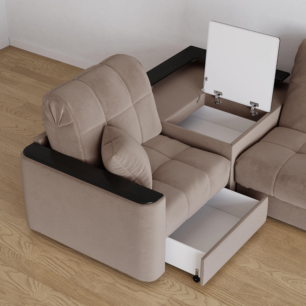 - Вместительная система хранения. Под баром расположен вместительный короб, а в угловом модуле — глубокий ящик. В них удобно хранить одеяла, подушки, пледы и постельное белье.