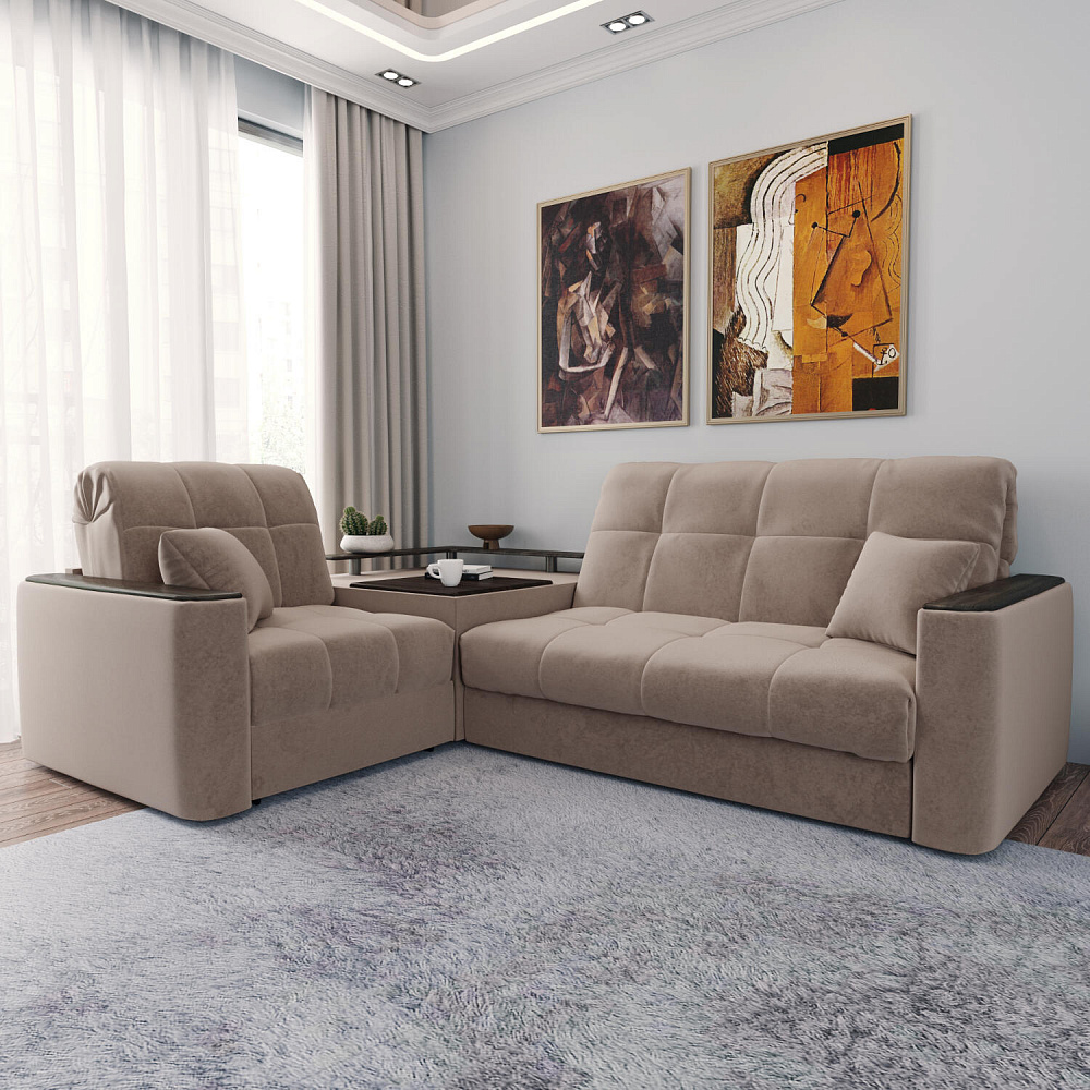 Диван угловой «Камелот» с баром станет главным местом для отдыха и приема гостей. Модель оснащена баром, на котором можно расположить еду и напитки во время просмотра фильмов и сериалов. Пропорциональные формы, плавные линии на сиденье и спинке подчеркивают лаконичный дизайн, поэтому диван подойдёт для любого современного интерьера. Диван создаст в комнате комфортную обстановку и придаст ей неповторимый вид.