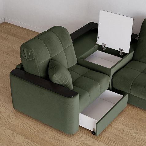 - Вместительная система хранения. Под баром расположен вместительный короб, а в угловом модуле — глубокий ящик. В них удобно хранить одеяла, подушки, пледы и постельное белье.