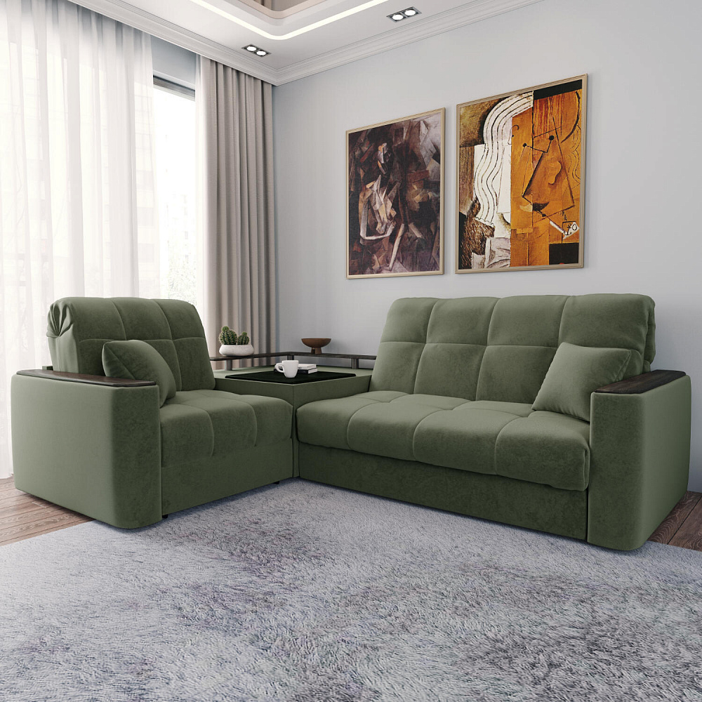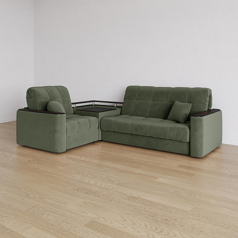 Диван угловой «Камелот» с баром станет главным местом для отдыха и приема гостей. Модель оснащена баром, на котором можно расположить еду и напитки во время просмотра фильмов и сериалов. Пропорциональные формы, плавные линии на сиденье и спинке подчеркивают лаконичный дизайн, поэтому диван подойдёт для любого современного интерьера. Диван создаст в комнате комфортную обстановку и придаст ей неповторимый вид.