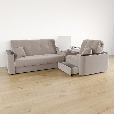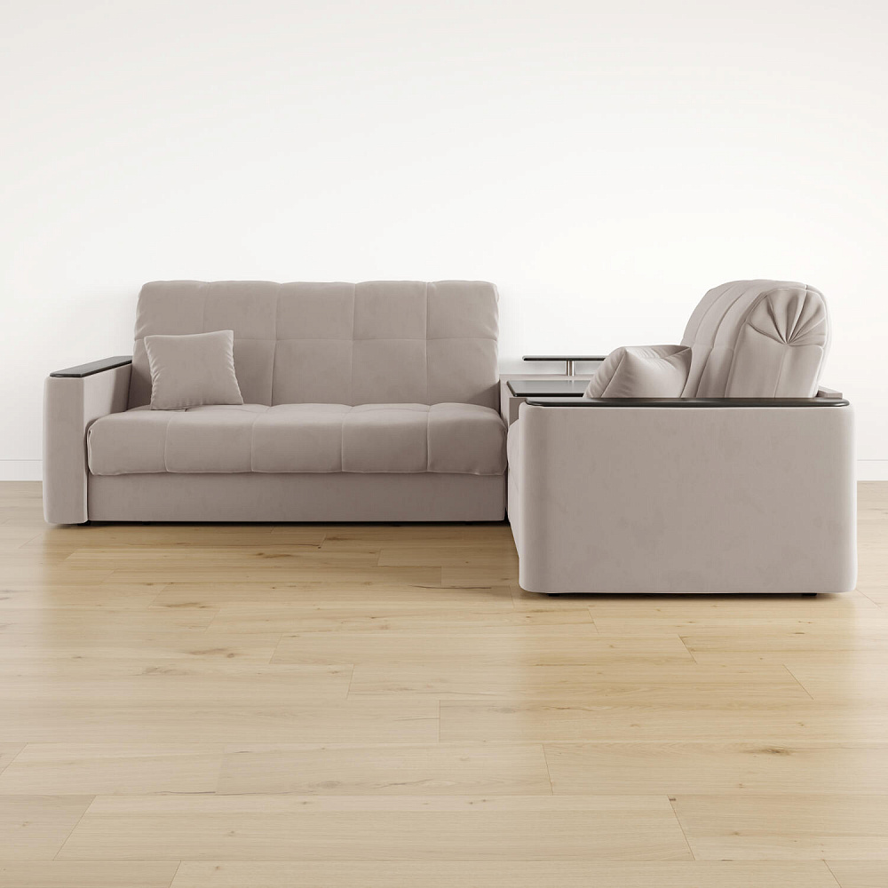 Диван угловой «Камелот» с баром станет главным местом для отдыха и приема гостей. Модель оснащена баром, на котором можно расположить еду и напитки во время просмотра фильмов и сериалов. Пропорциональные формы, плавные линии на сиденье и спинке подчеркивают лаконичный дизайн, поэтому диван подойдёт для любого современного интерьера. Диван создаст в комнате комфортную обстановку и придаст ей неповторимый вид.