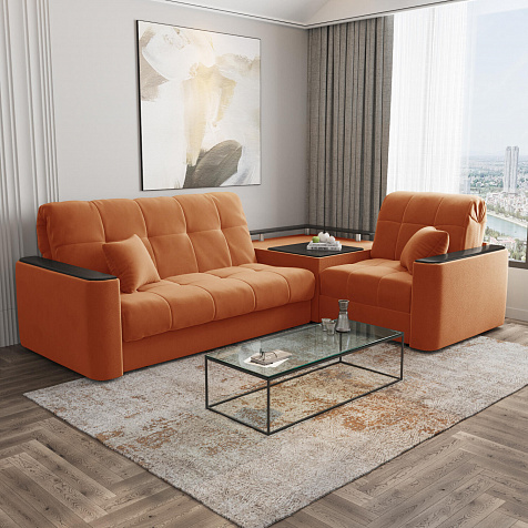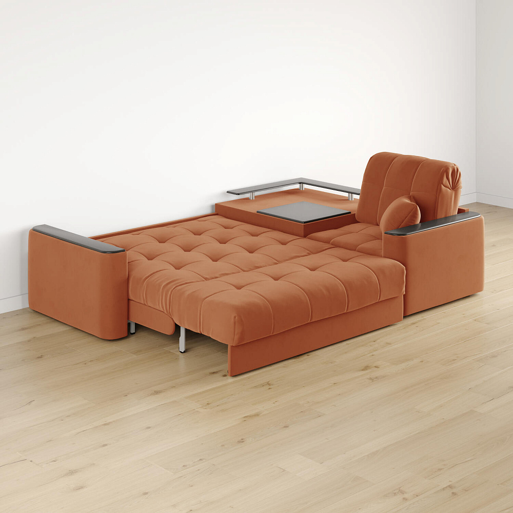 Диван угловой «Камелот» с баром станет главным местом для отдыха и приема гостей. Модель оснащена баром, на котором можно расположить еду и напитки во время просмотра фильмов и сериалов. Пропорциональные формы, плавные линии на сиденье и спинке подчеркивают лаконичный дизайн, поэтому диван подойдёт для любого современного интерьера. Диван создаст в комнате комфортную обстановку и придаст ей неповторимый вид.