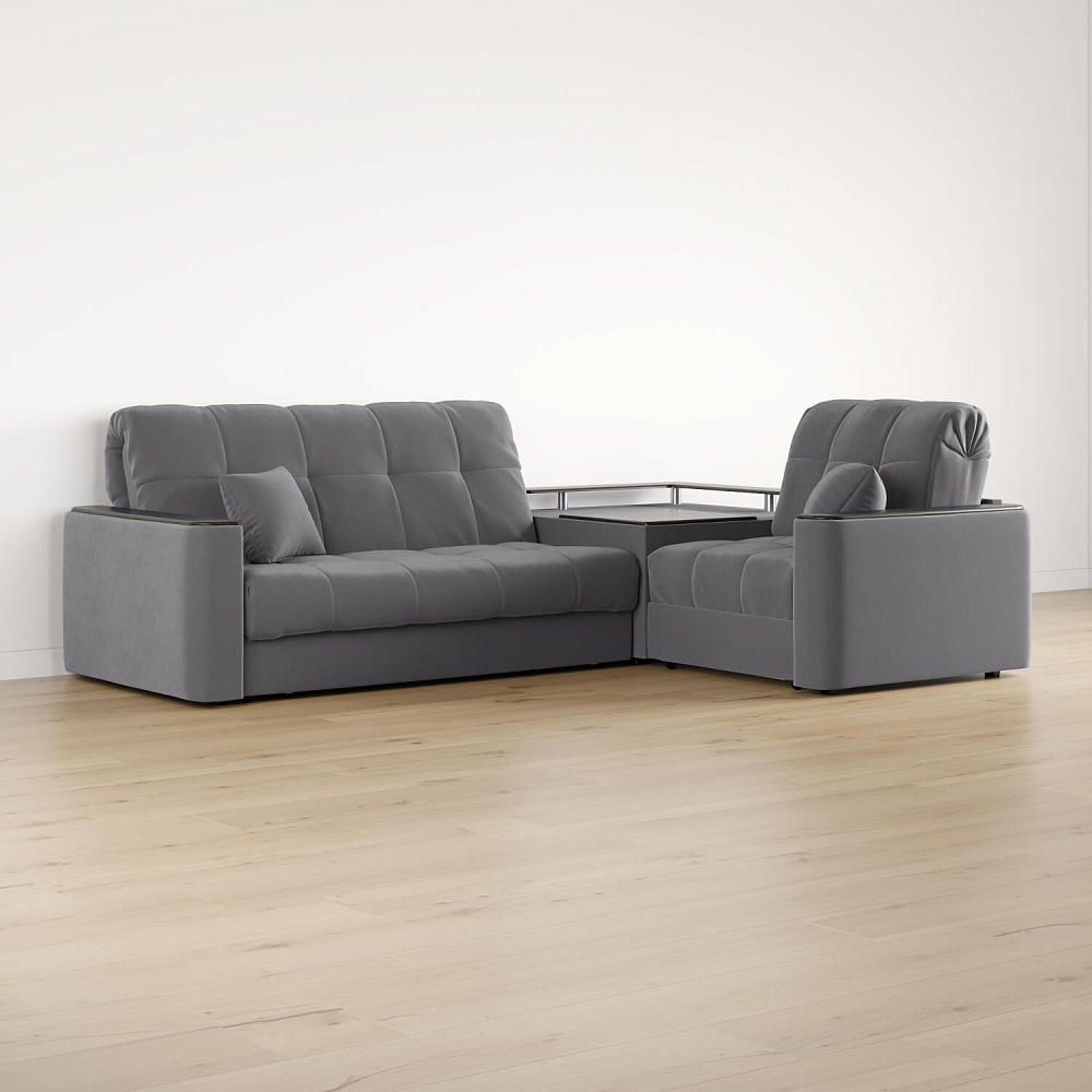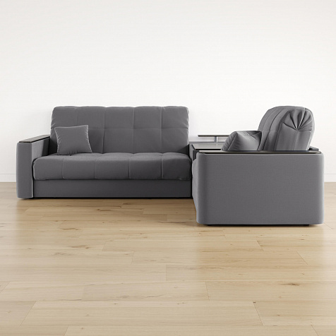 Диван угловой «Камелот» с баром станет главным местом для отдыха и приема гостей. Модель оснащена баром, на котором можно расположить еду и напитки во время просмотра фильмов и сериалов. Пропорциональные формы, плавные линии на сиденье и спинке подчеркивают лаконичный дизайн, поэтому диван подойдёт для любого современного интерьера. Диван создаст в комнате комфортную обстановку и придаст ей неповторимый вид.