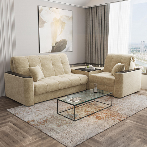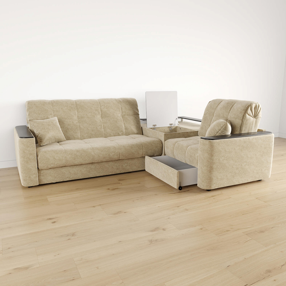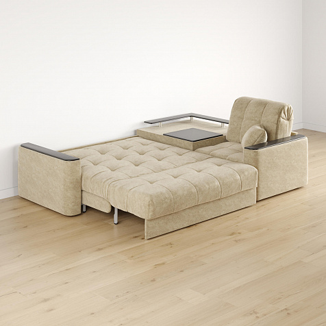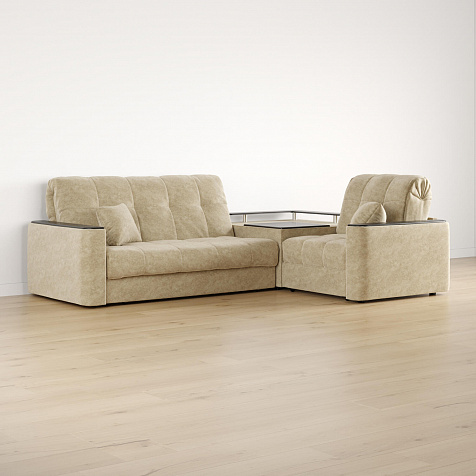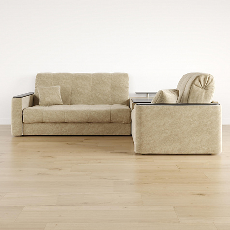 Диван угловой «Камелот» с баром станет главным местом для отдыха и приема гостей. Модель оснащена баром, на котором можно расположить еду и напитки во время просмотра фильмов и сериалов. Пропорциональные формы, плавные линии на сиденье и спинке подчеркивают лаконичный дизайн, поэтому диван подойдёт для любого современного интерьера. Диван создаст в комнате комфортную обстановку и придаст ей неповторимый вид.