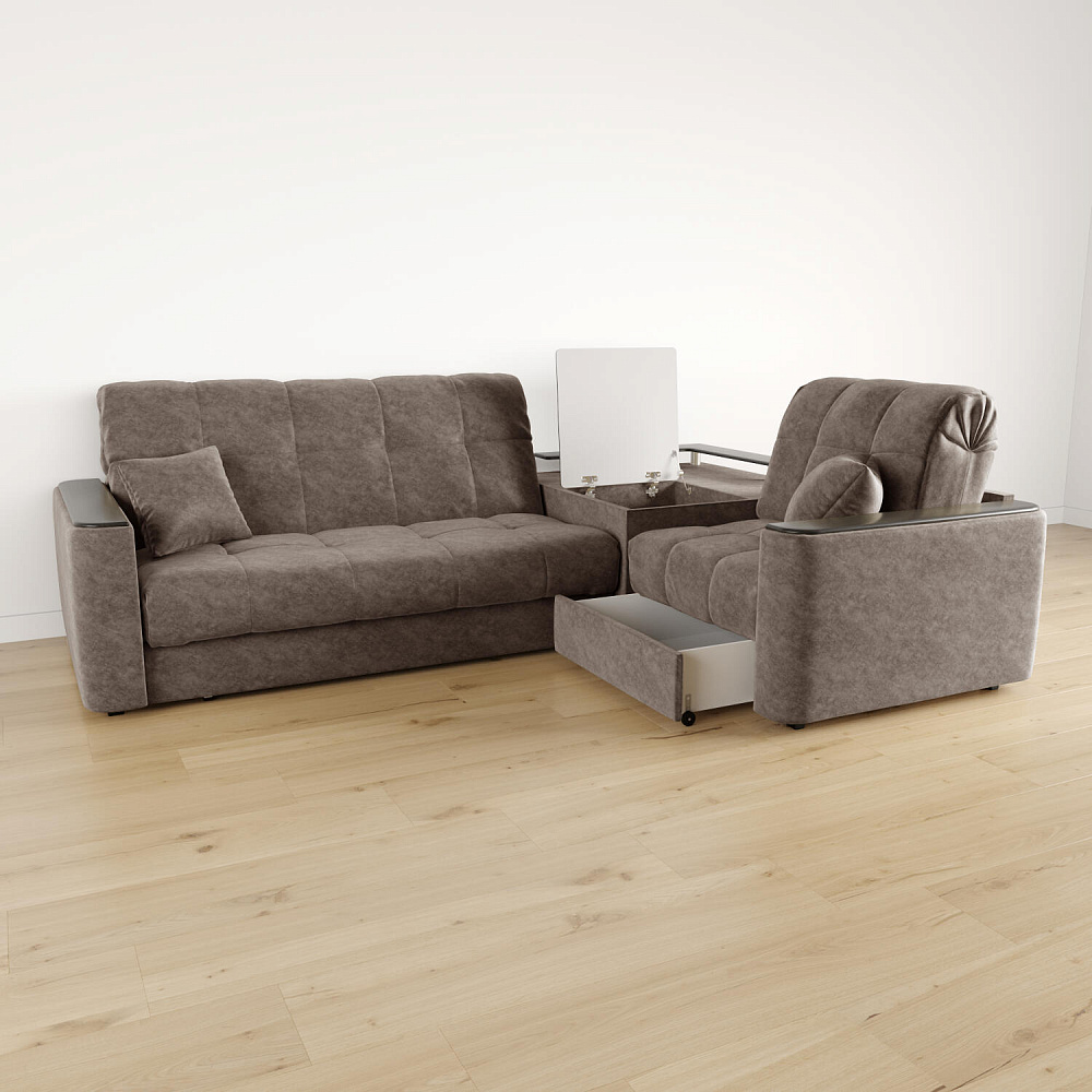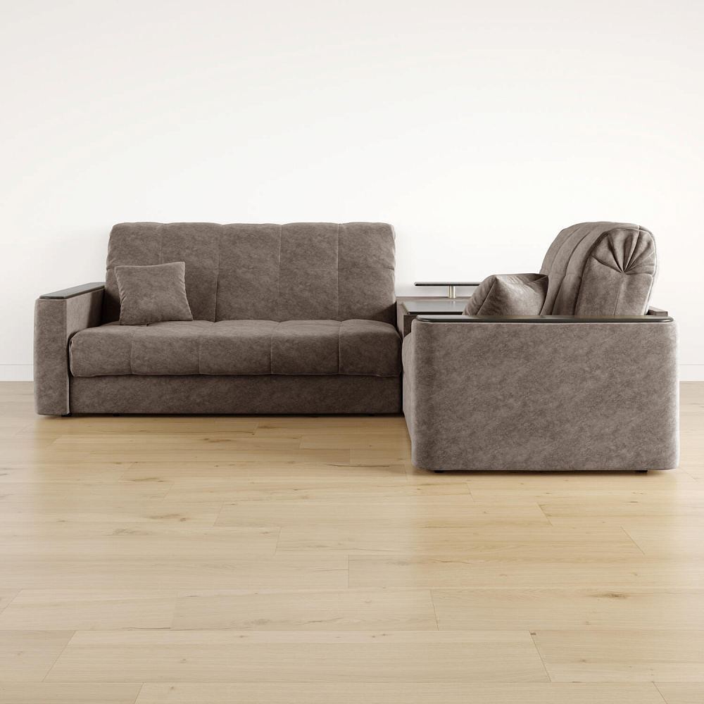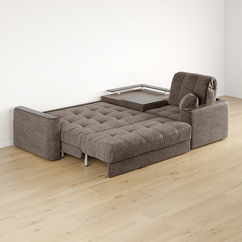 Диван угловой «Камелот» с баром станет главным местом для отдыха и приема гостей. Модель оснащена баром, на котором можно расположить еду и напитки во время просмотра фильмов и сериалов. Пропорциональные формы, плавные линии на сиденье и спинке подчеркивают лаконичный дизайн, поэтому диван подойдёт для любого современного интерьера. Диван создаст в комнате комфортную обстановку и придаст ей неповторимый вид.