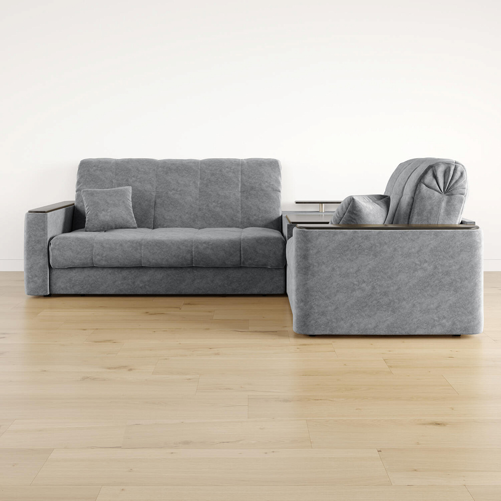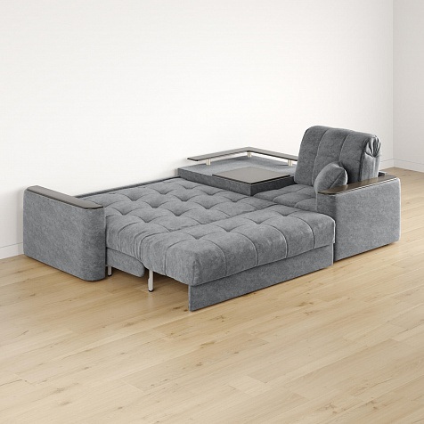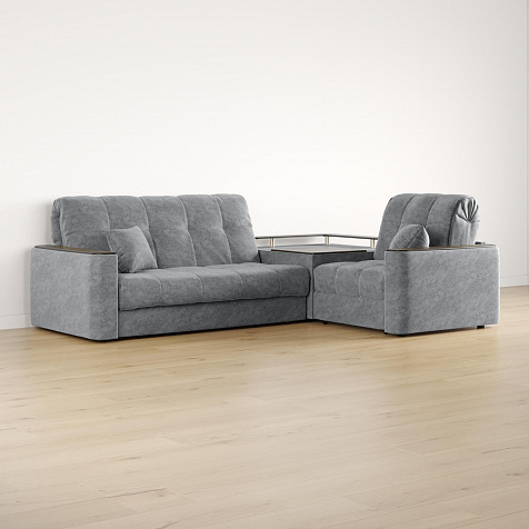 Диван угловой «Камелот» с баром станет главным местом для отдыха и приема гостей. Модель оснащена баром, на котором можно расположить еду и напитки во время просмотра фильмов и сериалов. Пропорциональные формы, плавные линии на сиденье и спинке подчеркивают лаконичный дизайн, поэтому диван подойдёт для любого современного интерьера. Диван создаст в комнате комфортную обстановку и придаст ей неповторимый вид.