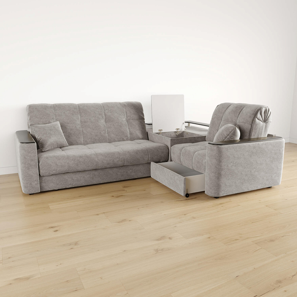 - Вместительная система хранения. Под баром расположен вместительный короб, а в угловом модуле — глубокий ящик. В них удобно хранить одеяла, подушки, пледы и постельное белье.
