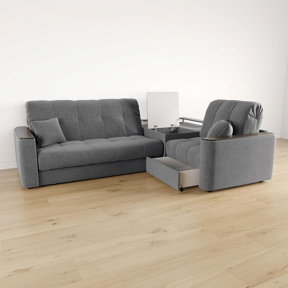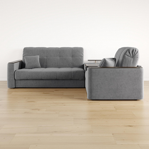 Диван угловой «Камелот» с баром станет главным местом для отдыха и приема гостей. Модель оснащена баром, на котором можно расположить еду и напитки во время просмотра фильмов и сериалов. Пропорциональные формы, плавные линии на сиденье и спинке подчеркивают лаконичный дизайн, поэтому диван подойдёт для любого современного интерьера. Диван создаст в комнате комфортную обстановку и придаст ей неповторимый вид.