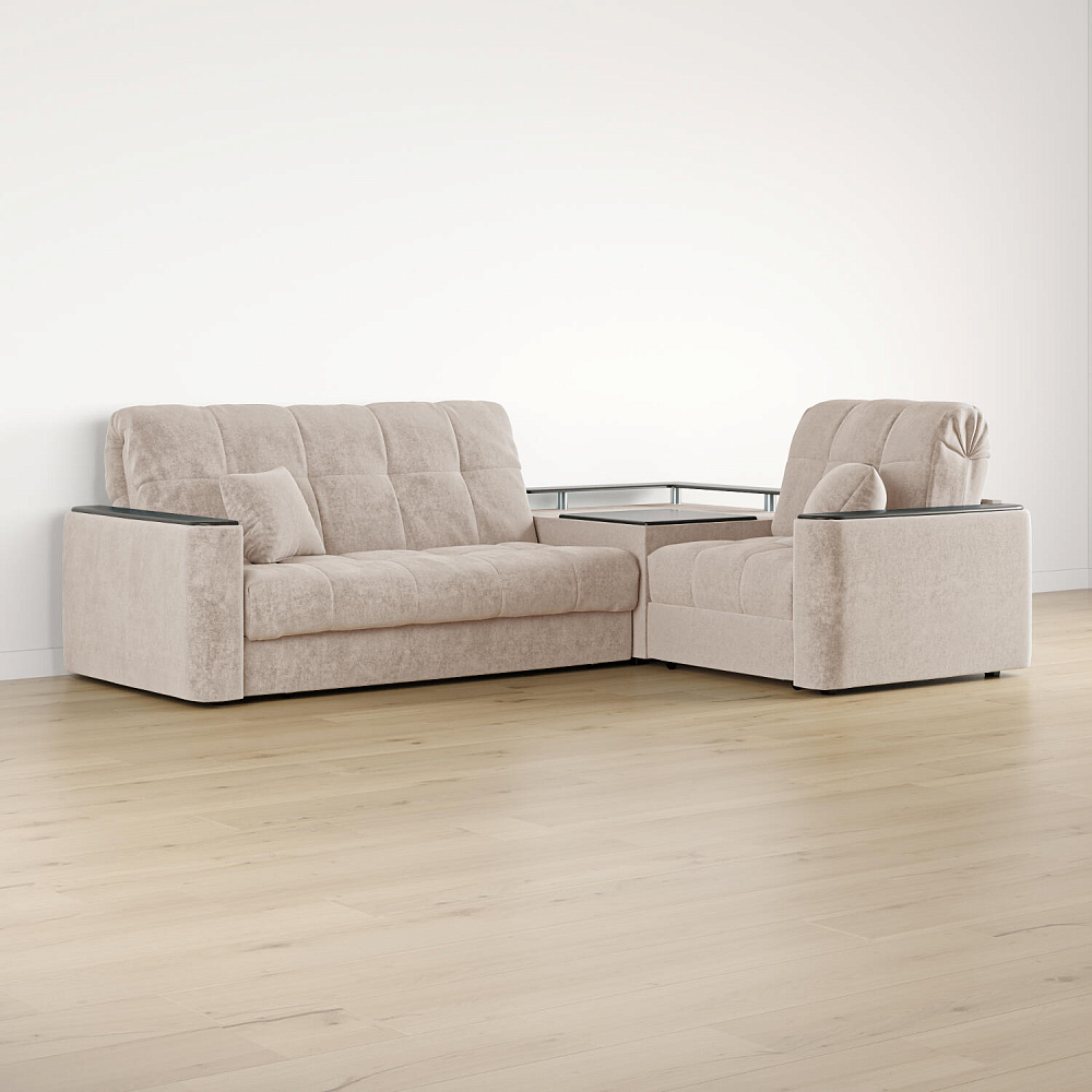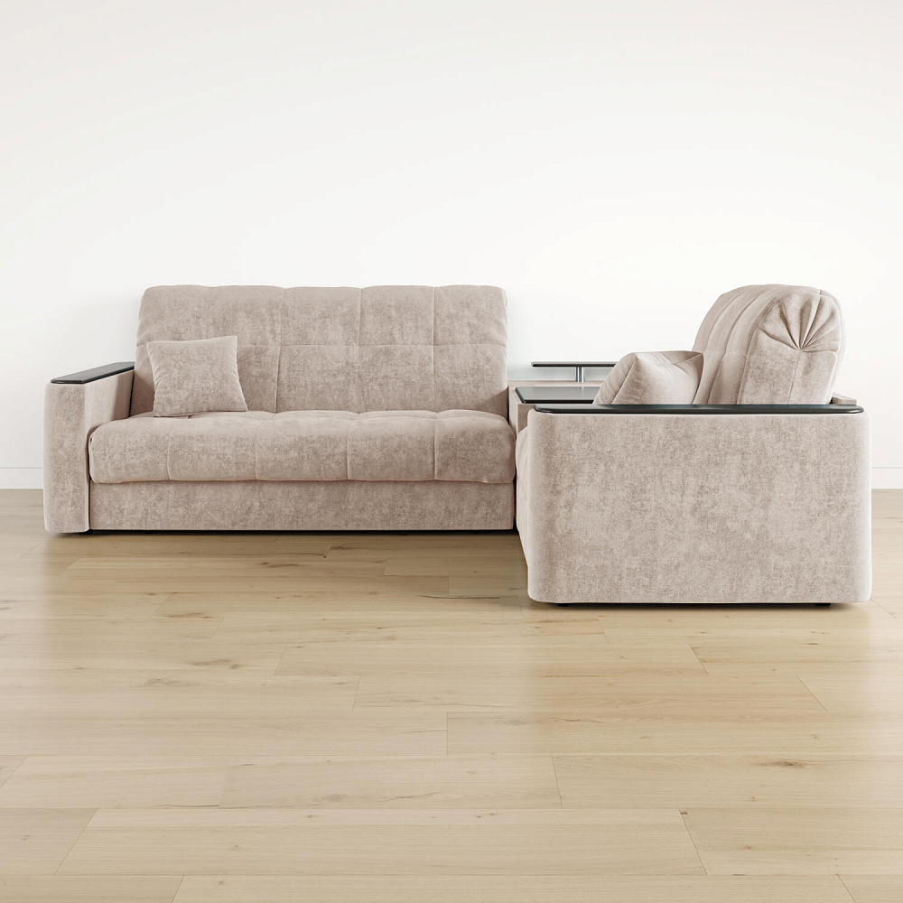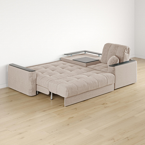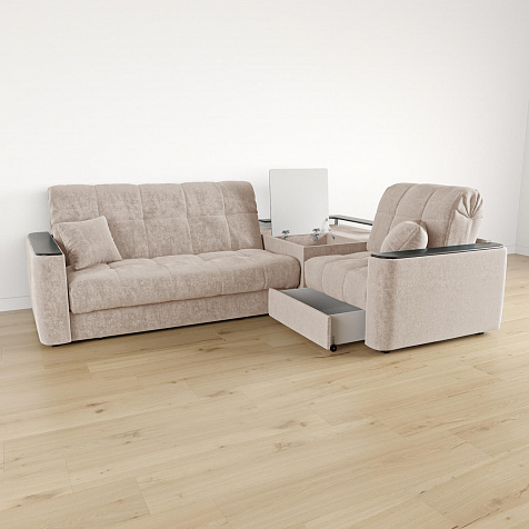 Диван угловой «Камелот» с баром станет главным местом для отдыха и приема гостей. Модель оснащена баром, на котором можно расположить еду и напитки во время просмотра фильмов и сериалов. Пропорциональные формы, плавные линии на сиденье и спинке подчеркивают лаконичный дизайн, поэтому диван подойдёт для любого современного интерьера. Диван создаст в комнате комфортную обстановку и придаст ей неповторимый вид.