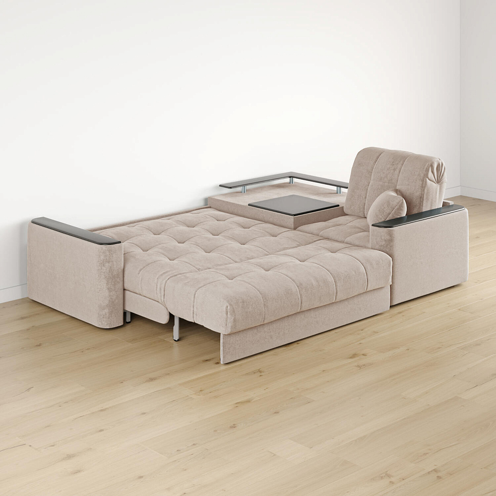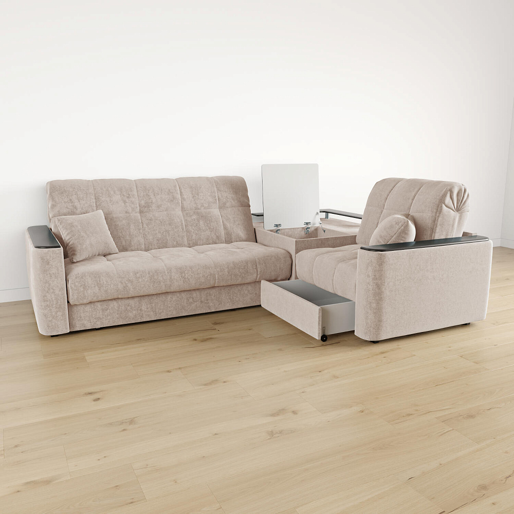 - Вместительная система хранения. Под баром расположен вместительный короб, а в угловом модуле — глубокий ящик. В них удобно хранить одеяла, подушки, пледы и постельное белье.