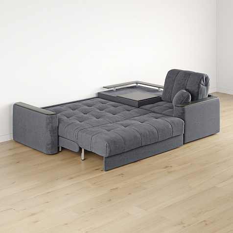 - Вместительная система хранения. Под баром расположен вместительный короб, а в угловом модуле — глубокий ящик. В них удобно хранить одеяла, подушки, пледы и постельное белье.