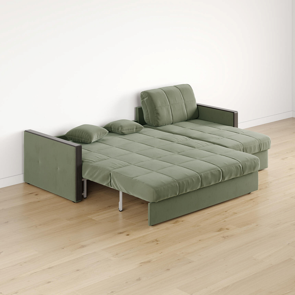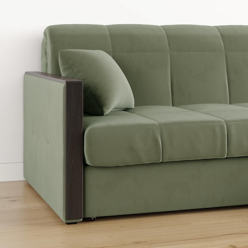Механизм трансформации «Аккордеон». Чтобы разложить диван, необходимо приподнять сиденье и слегка потянуть на себя, далее диван разложится сам. Поверхность спального места ровная, без петель и швов, поэтому сон будет приятным и комфортным. Прорезиненные ролики защитят напольное покрытие от истирания.
