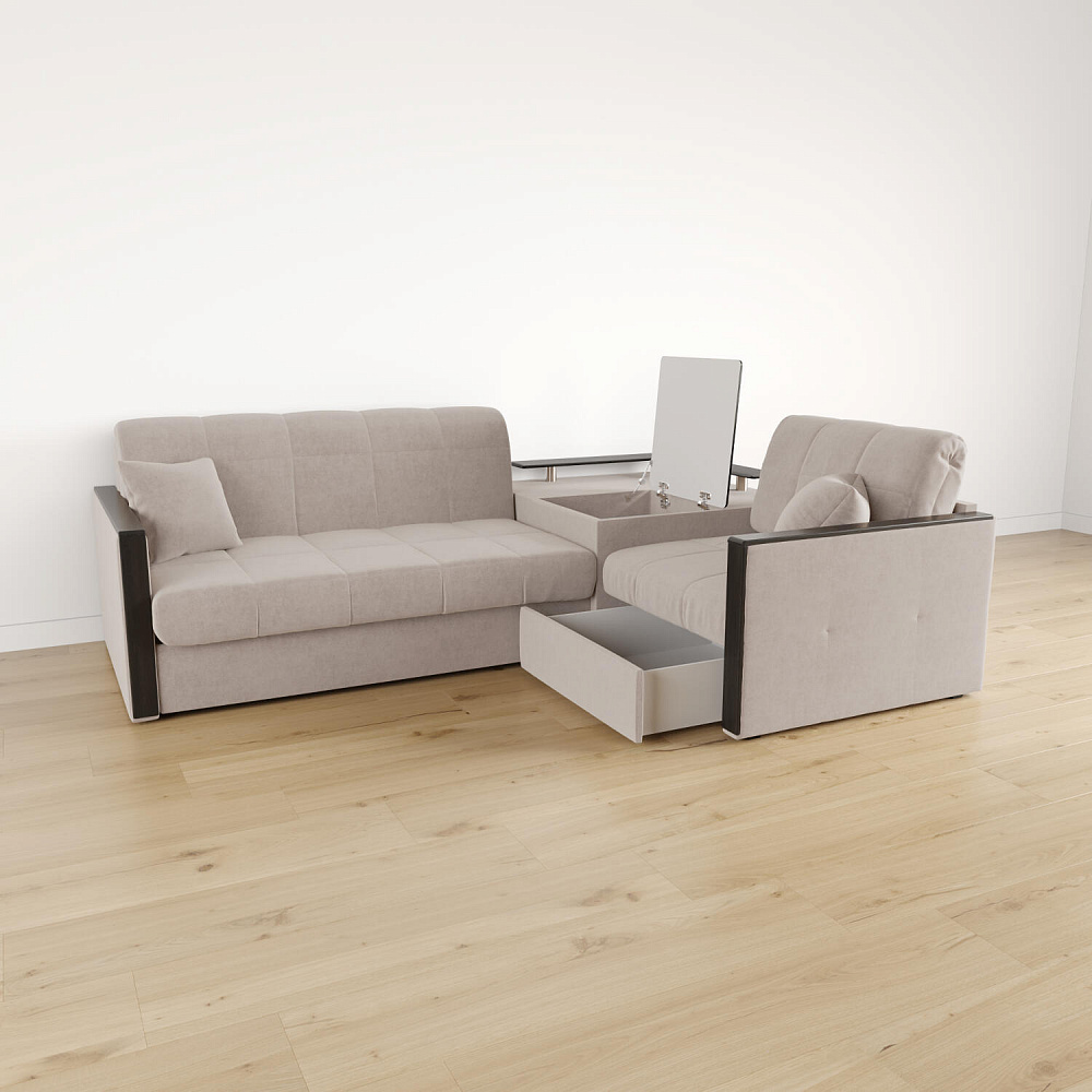 Вместительная система хранения. Под баром расположен вместительный короб, а в угловом модуле — глубокий ящик. В них удобно хранить одеяла, подушки, пледы и постельное белье.