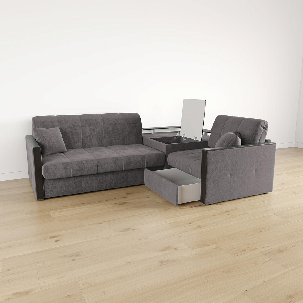 Вместительная система хранения. Под баром расположен вместительный короб, а в угловом модуле — глубокий ящик. В них удобно хранить одеяла, подушки, пледы и постельное белье.