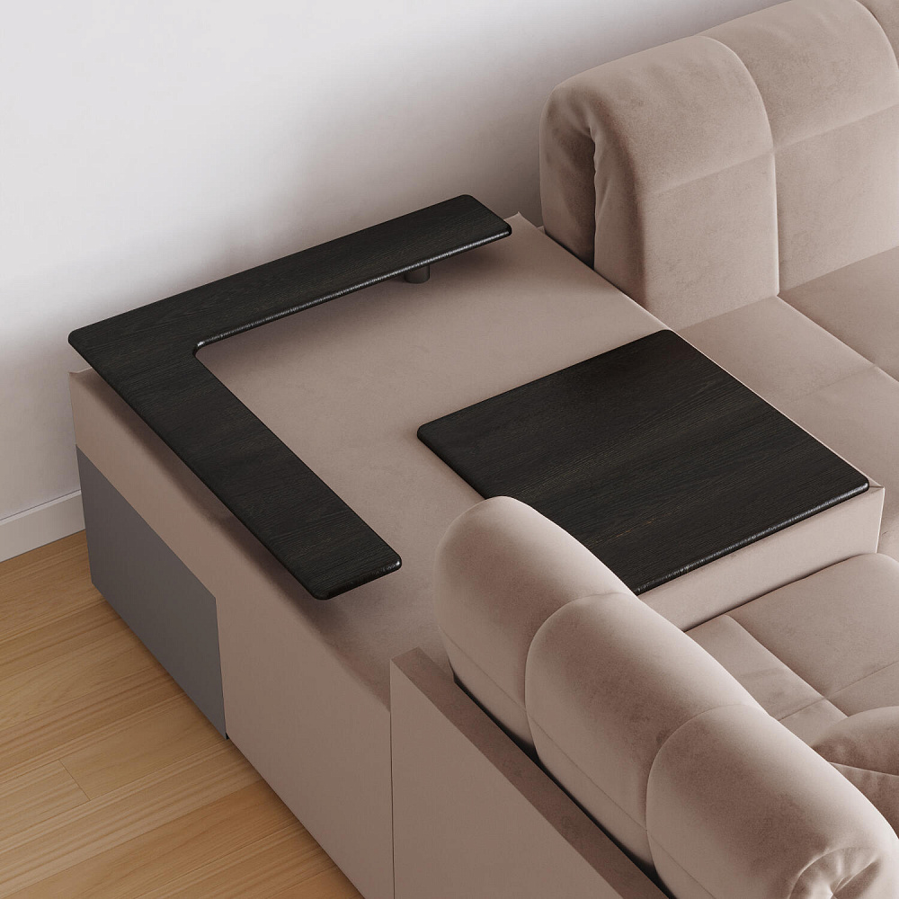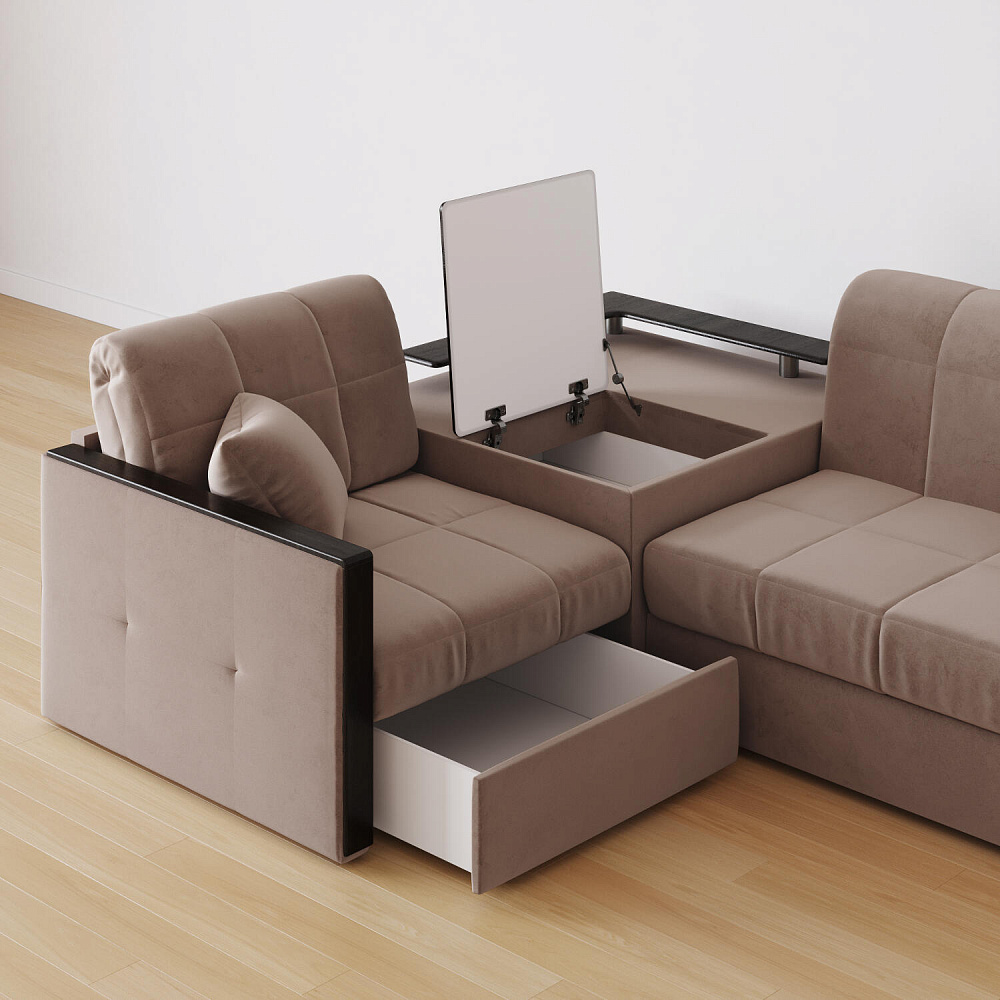 Вместительная система хранения. Под баром расположен вместительный короб, а в угловом модуле — глубокий ящик. В них удобно хранить одеяла, подушки, пледы и постельное белье.