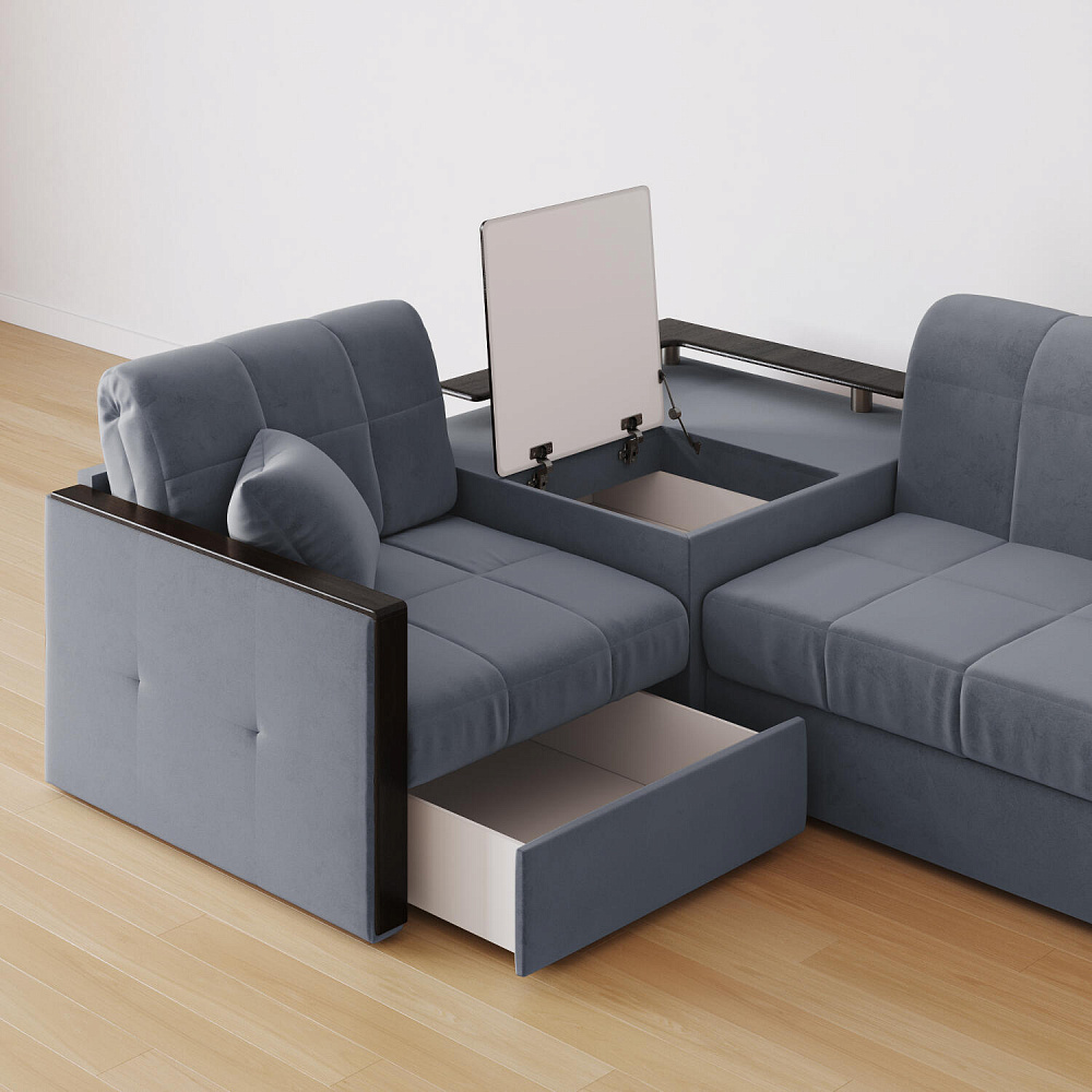 Вместительная система хранения. Под баром расположен вместительный короб, а в угловом модуле — глубокий ящик. В них удобно хранить одеяла, подушки, пледы и постельное белье.