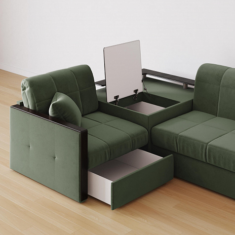 Вместительная система хранения. Под баром расположен вместительный короб, а в угловом модуле — глубокий ящик. В них удобно хранить одеяла, подушки, пледы и постельное белье.