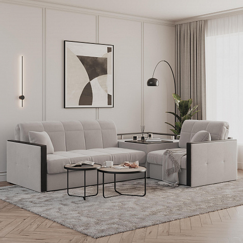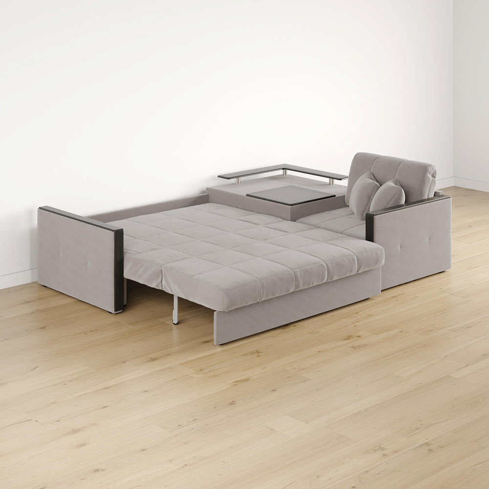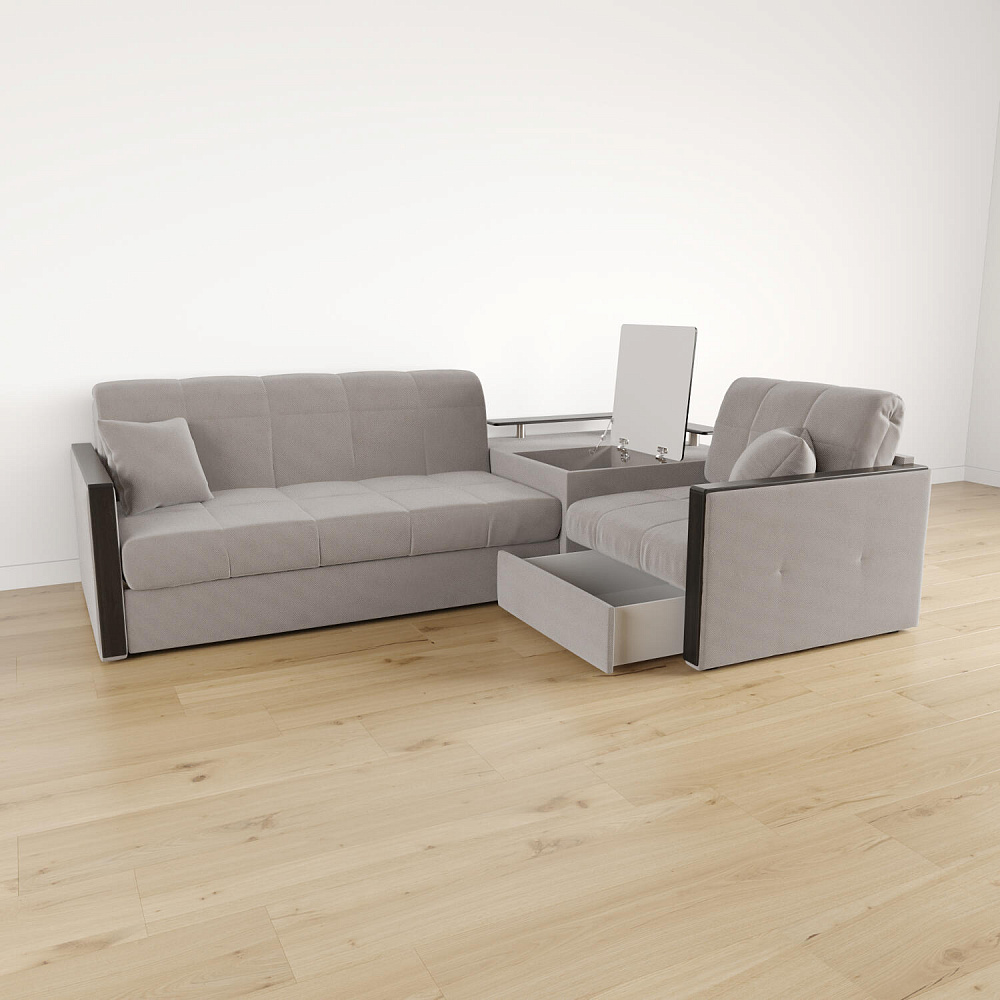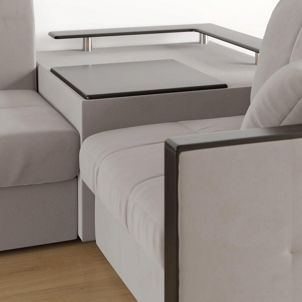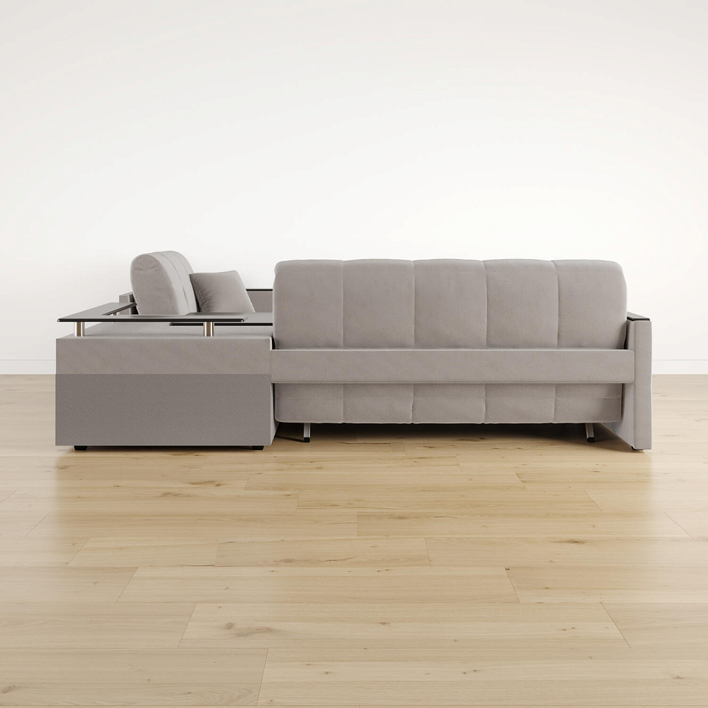 Угловой диван «Бристоль» с баром станет главным местом для отдыха и приема гостей. Модель оснащена баром, на котором можно расположить еду и напитки во время просмотра фильмов и сериалов. Вместительный короб и ящик для постельных принадлежностей. Благодаря механизму трансформации «Аккордеон» диван легко превращается в полноценную кровать для двух человек. Пропорциональные формы, плавные линии декоративного канта подчеркивают лаконичный дизайн, поэтому диван подойдет для любого современного интерьера.
