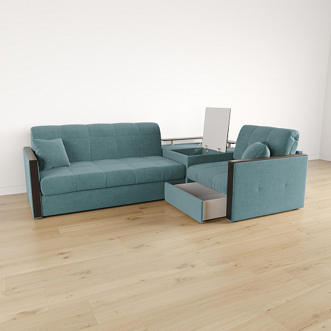 Вместительная система хранения. Под баром расположен вместительный короб, а в угловом модуле — глубокий ящик. В них удобно хранить одеяла, подушки, пледы и постельное белье.