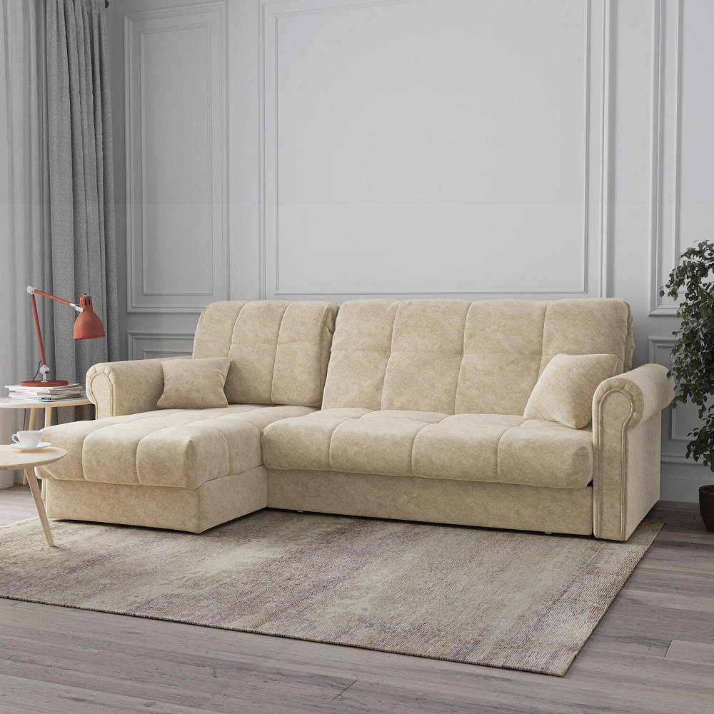 - Универсальный угол. Диван подстроится под условия помещения — оттоманка устанавливается как слева, так и справа.