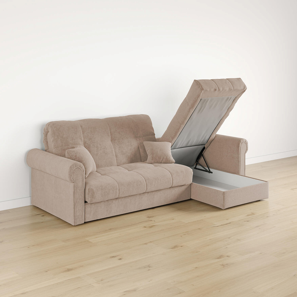 - Короб для белья. В оттоманке дивана скрыт просторный бельевой ящик, в котором можно разместить все необходимые постельные принадлежности.