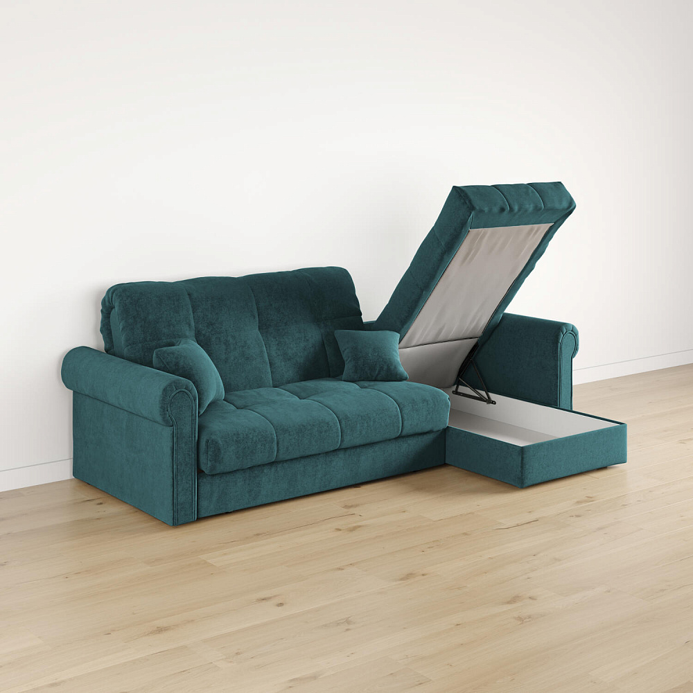 - Короб для белья. В оттоманке дивана скрыт просторный бельевой ящик, в котором можно разместить все необходимые постельные принадлежности.