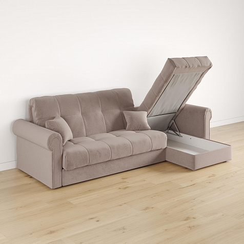 - Короб для белья. В оттоманке дивана скрыт просторный бельевой ящик, в котором можно разместить все необходимые постельные принадлежности.