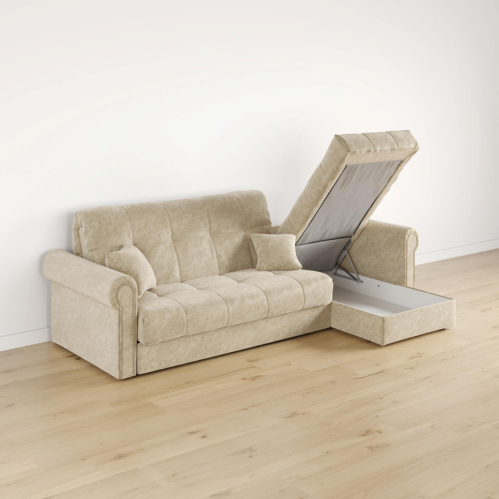 - Короб для белья. В оттоманке дивана скрыт просторный бельевой ящик, в котором можно разместить все необходимые постельные принадлежности.