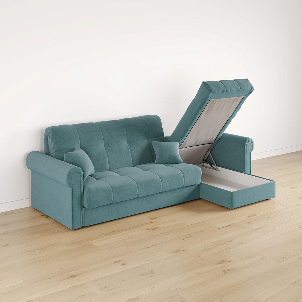 - Короб для белья. В оттоманке дивана скрыт просторный бельевой ящик, в котором можно разместить все необходимые постельные принадлежности.