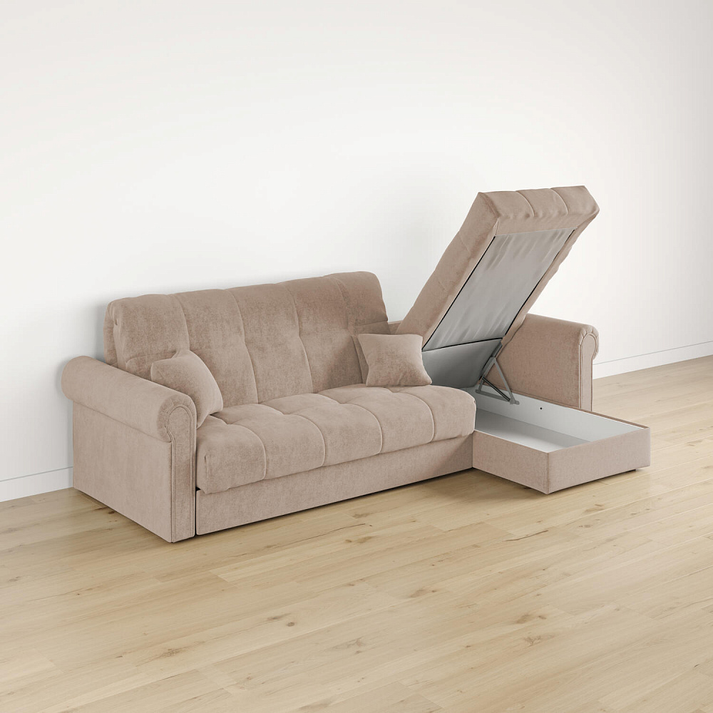 - Короб для белья. В оттоманке дивана скрыт просторный бельевой ящик, в котором можно разместить все необходимые постельные принадлежности.