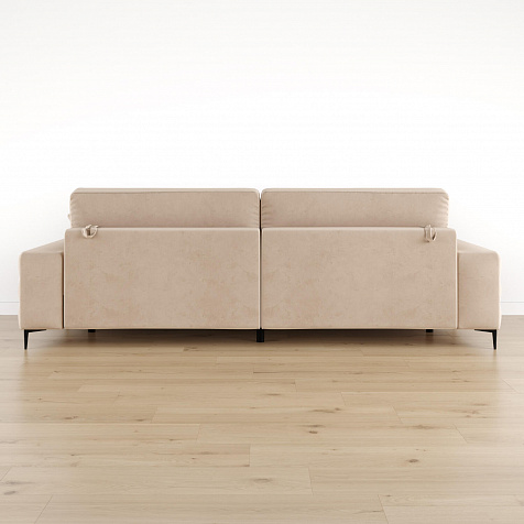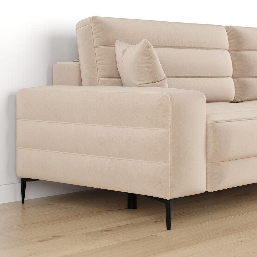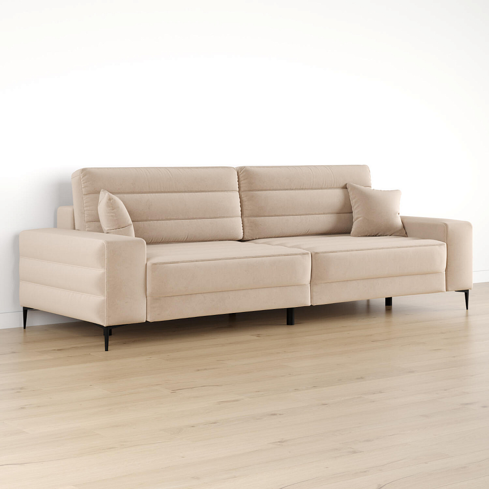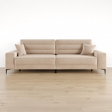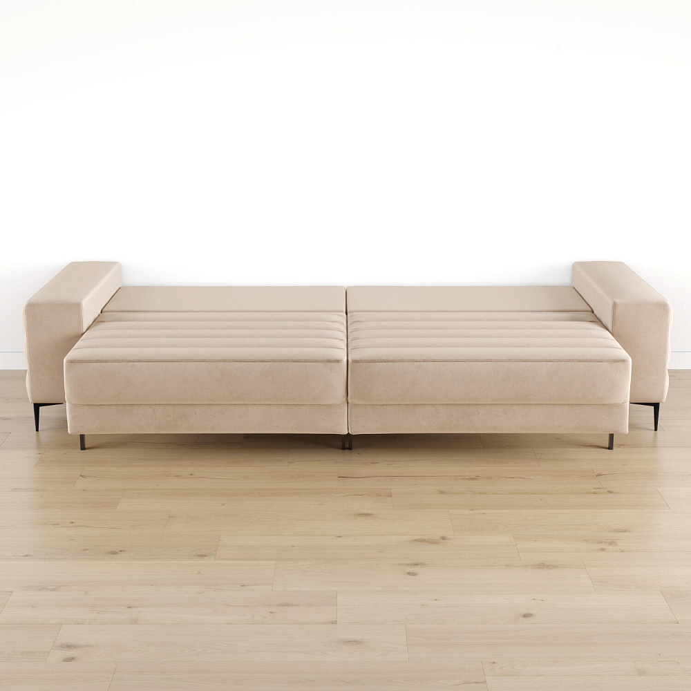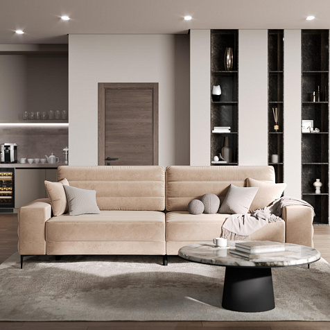 Диван «Лиам» создан для любых современных интерьеров, особенно в стиле минимализм или джапанди. Прямоугольные формы, горизонтальная строчка на каждом элементе дивана и тонкие черные опоры образуют элегантный образ. Простой в использовании механизм трансформации поможет быстро разложить диван и создать просторное спальное место. Также «Лиам» имеет вместительное место хранения под сиденьем для множества вещей.