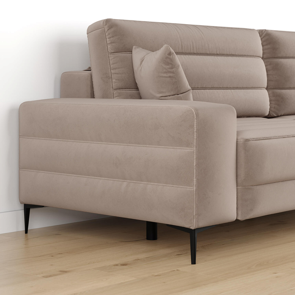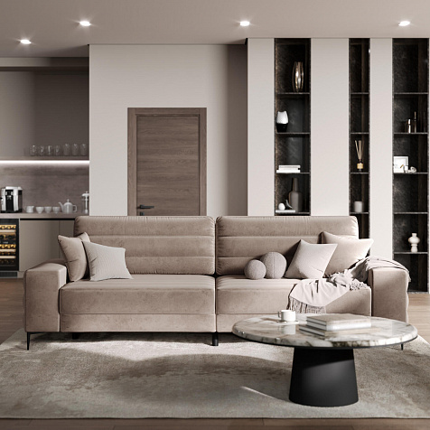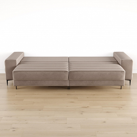 Диван «Лиам» создан для любых современных интерьеров, особенно в стиле минимализм или джапанди. Прямоугольные формы, горизонтальная строчка на каждом элементе дивана и тонкие черные опоры образуют элегантный образ. Простой в использовании механизм трансформации поможет быстро разложить диван и создать просторное спальное место. Также «Лиам» имеет вместительное место хранения под сиденьем для множества вещей.