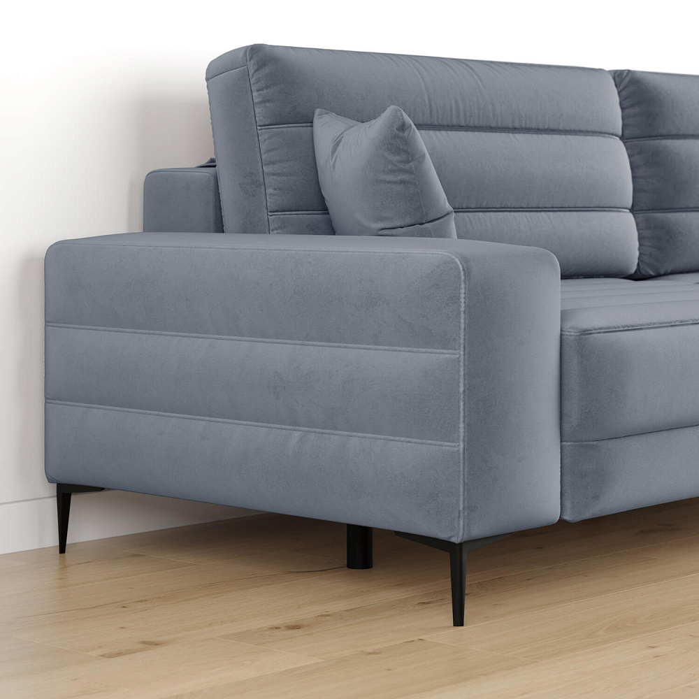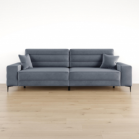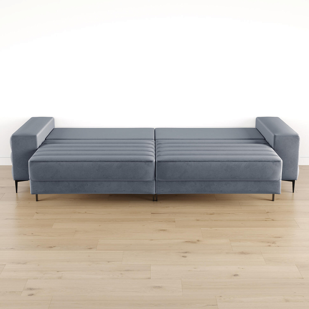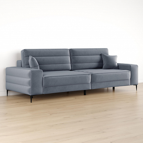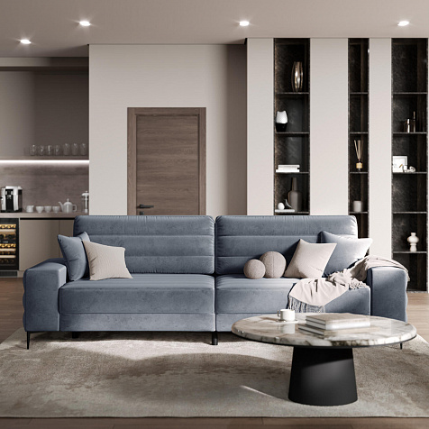 Диван «Лиам» создан для любых современных интерьеров, особенно в стиле минимализм или джапанди. Прямоугольные формы, горизонтальная строчка на каждом элементе дивана и тонкие черные опоры образуют элегантный образ. Простой в использовании механизм трансформации поможет быстро разложить диван и создать просторное спальное место. Также «Лиам» имеет вместительное место хранения под сиденьем для множества вещей.