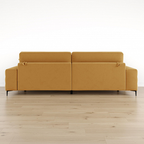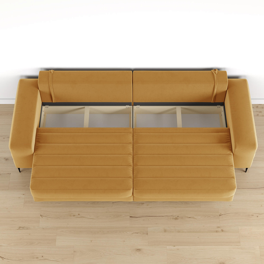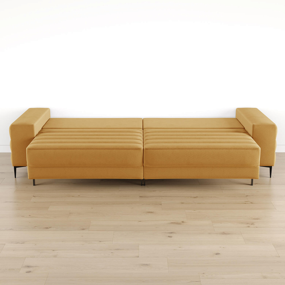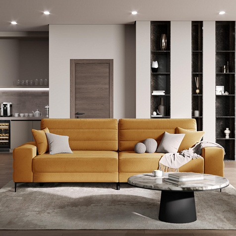 Диван «Лиам» создан для любых современных интерьеров, особенно в стиле минимализм или джапанди. Прямоугольные формы, горизонтальная строчка на каждом элементе дивана и тонкие черные опоры образуют элегантный образ. Простой в использовании механизм трансформации поможет быстро разложить диван и создать просторное спальное место. Также «Лиам» имеет вместительное место хранения под сиденьем для множества вещей.